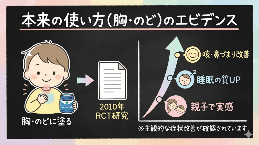 私なら、咳がひどい子どもには本来の使い方(胸やのどへの塗布)をまず勧めます。こちらにはRCTのエビデンスがありますから