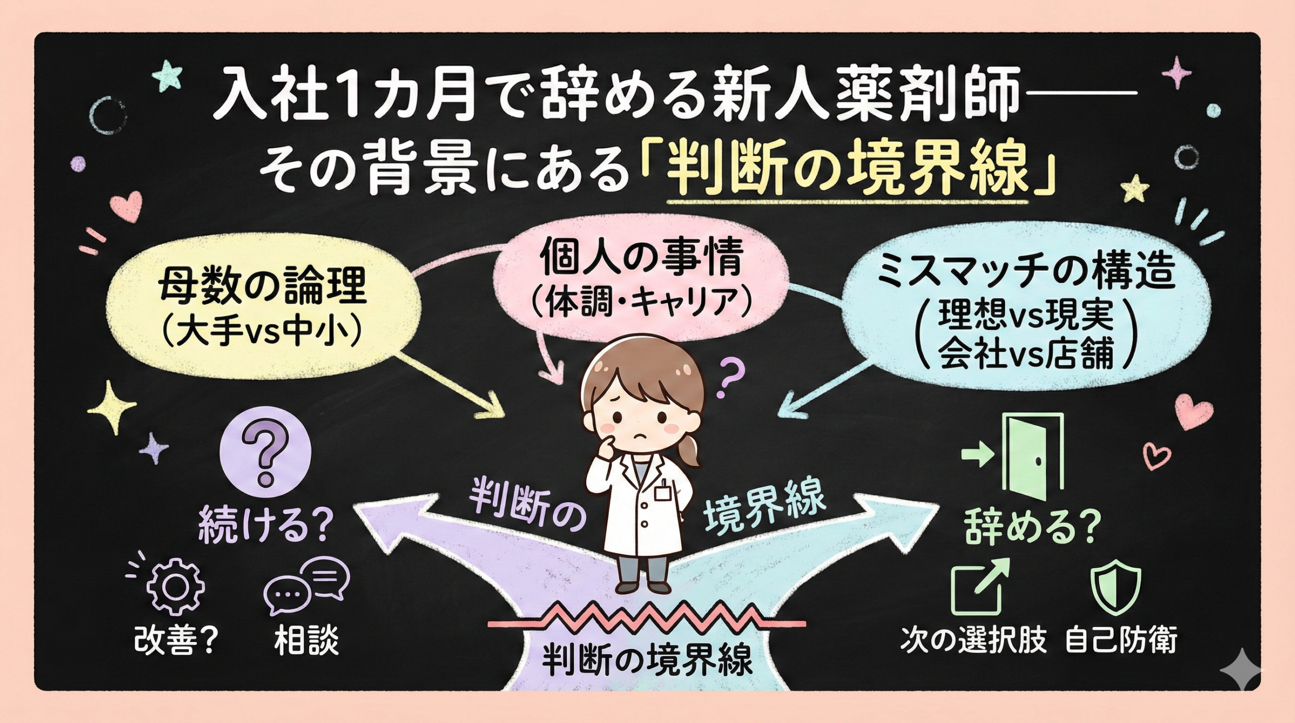 「辞めたい」「もう限界」「向いてないかも」──そう感じるのは、甘えでも能力不足でもない。環境から発せられる正当なシグナルであることがほとんどだ。ただ、つらさの渦中にいると「何がつらいのか」「どう動けばいいのか」が見えなくなる。このページでは、薬剤師が職場で抱えやすい悩みを状況別に整理し、それぞれに対応する記事をまとめた。「辞めたい」と思い始めた段階から、メンタルの問題、人間関係、制度への不満まで、今の状態に近いところから読んでほしい。全部読む必要はない。刺さる見出しがあれば、そこだけでいい。