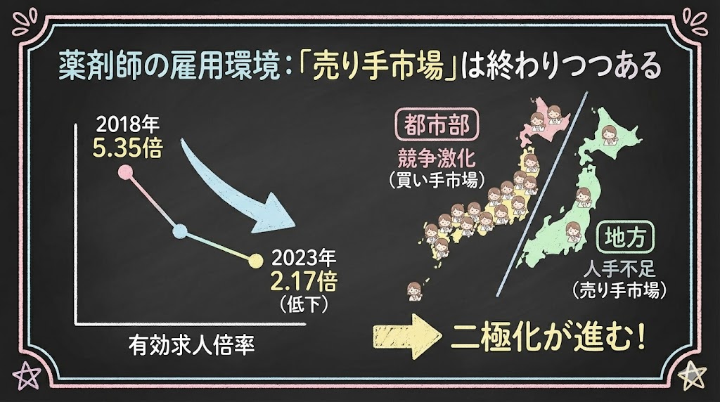 都市部では薬剤師が集中しているため、「薬剤師資格を持っていれば採用」という時代は終わりつつあります。一方で、地方や一部の業態(在宅に力を入れている薬局など)では依然として人手不足が続いています。