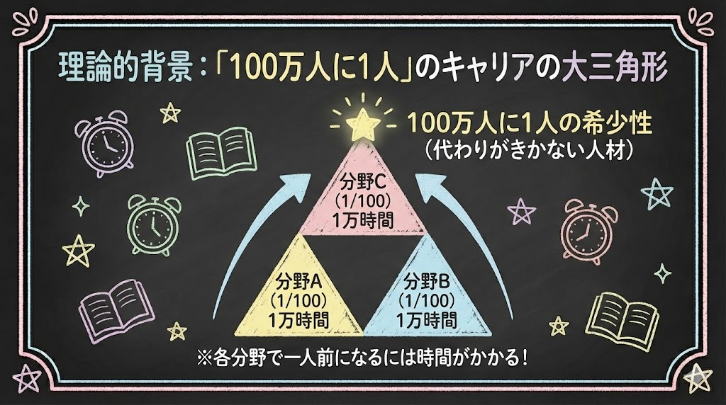「薬剤師×〇〇」という発想の背景には、教育改革実践家・藤原和博氏が提唱する「キャリアの大三角形」の考え方があります。